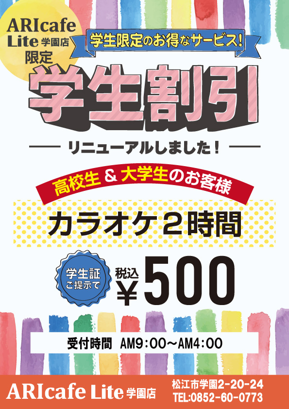 アリカフェLite学園店をご利用の学生の皆様へ! カラオケが…